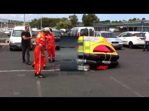 La SNSM percute à terre pour la démonstration un radeau de survie pour 8 personnes au Port (Réunion, France), lors d'une formation organisée par le CRPPS, le 13 septembre 2012.