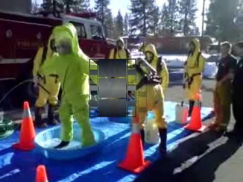 Fire Fighter Evan getting decon in a hazmat suit